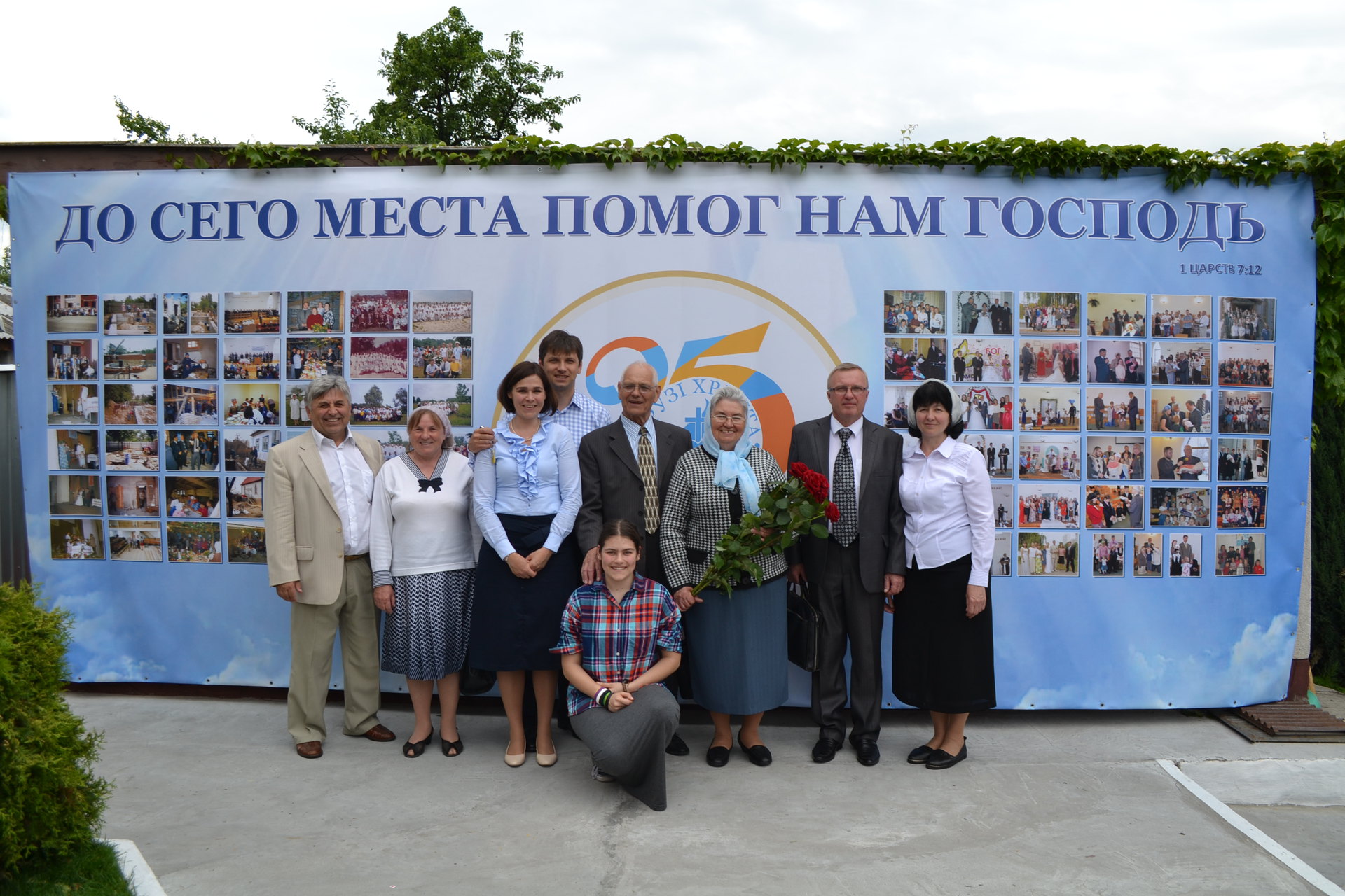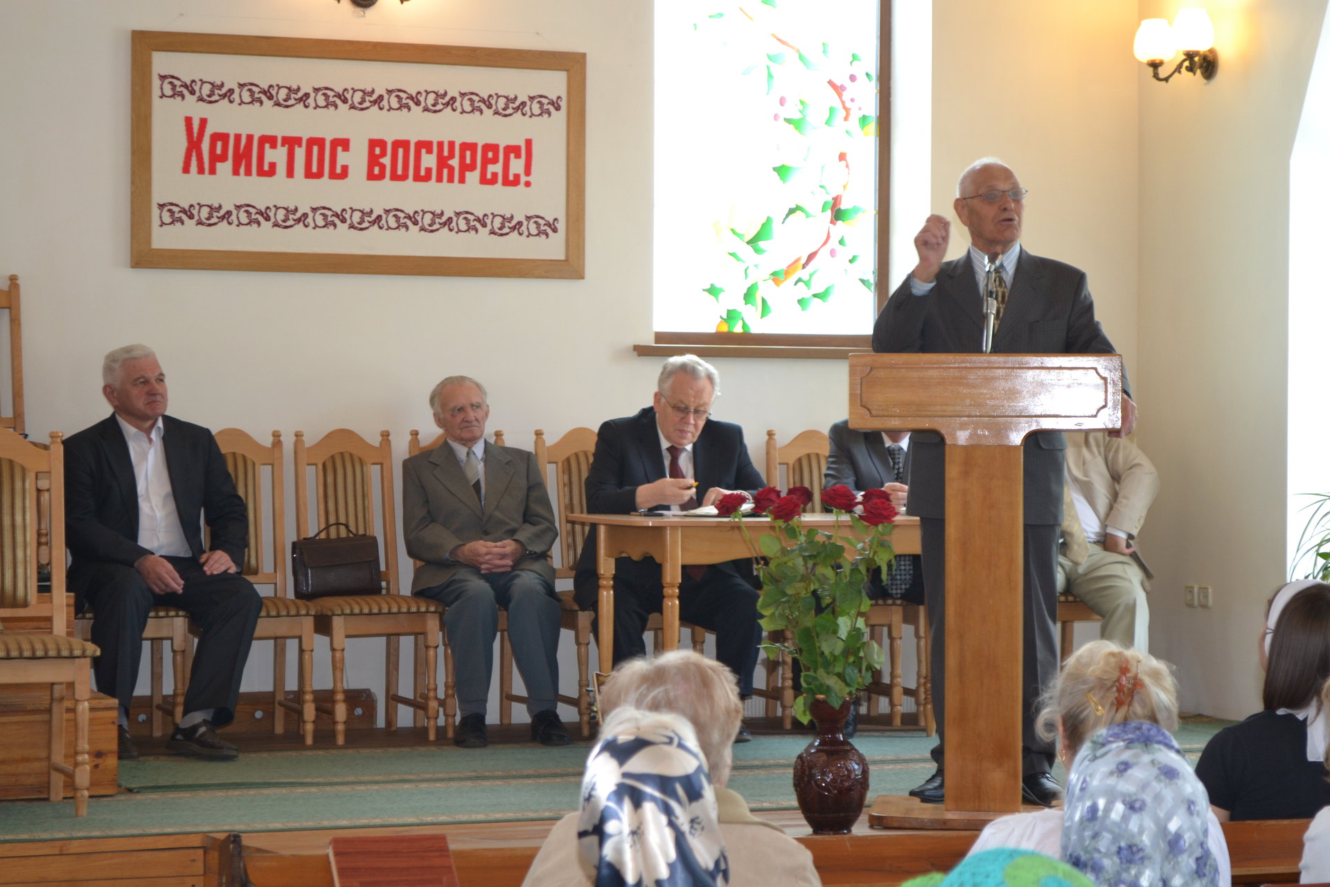 Затем Василенко Фомич, пастор, поделился воспоминаниями и рассказал о том как приобрели участок земли, на котором сейчас находится здание церкви, и о том как непросто было в Советском Союзе исповедывать Иисуса Христа. Как около пятисот членов церки с Левого берега ездили на богослужения в церковь по улице Пухова, 4, хотя зачастую не хватало денег на проезд и плохо ходил транспорт, и как начали арендовать актовый зал клуба "Энергетик" на время проведения вечернего богослужения.