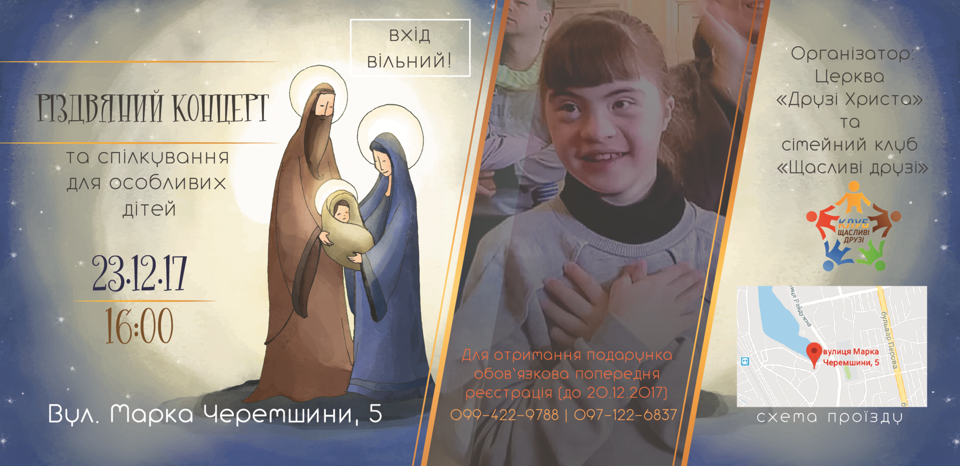 Ждём Вас на рождественский концерт и общение для особенных деток! КОГДА? - 23.12.2017г. ГДЕ? - ул. Марка Черемшини, 5 КОГО? - особенных деток и их родителей ЧТО БУДЕТ? Общение, игры и много-много сюрпризов!