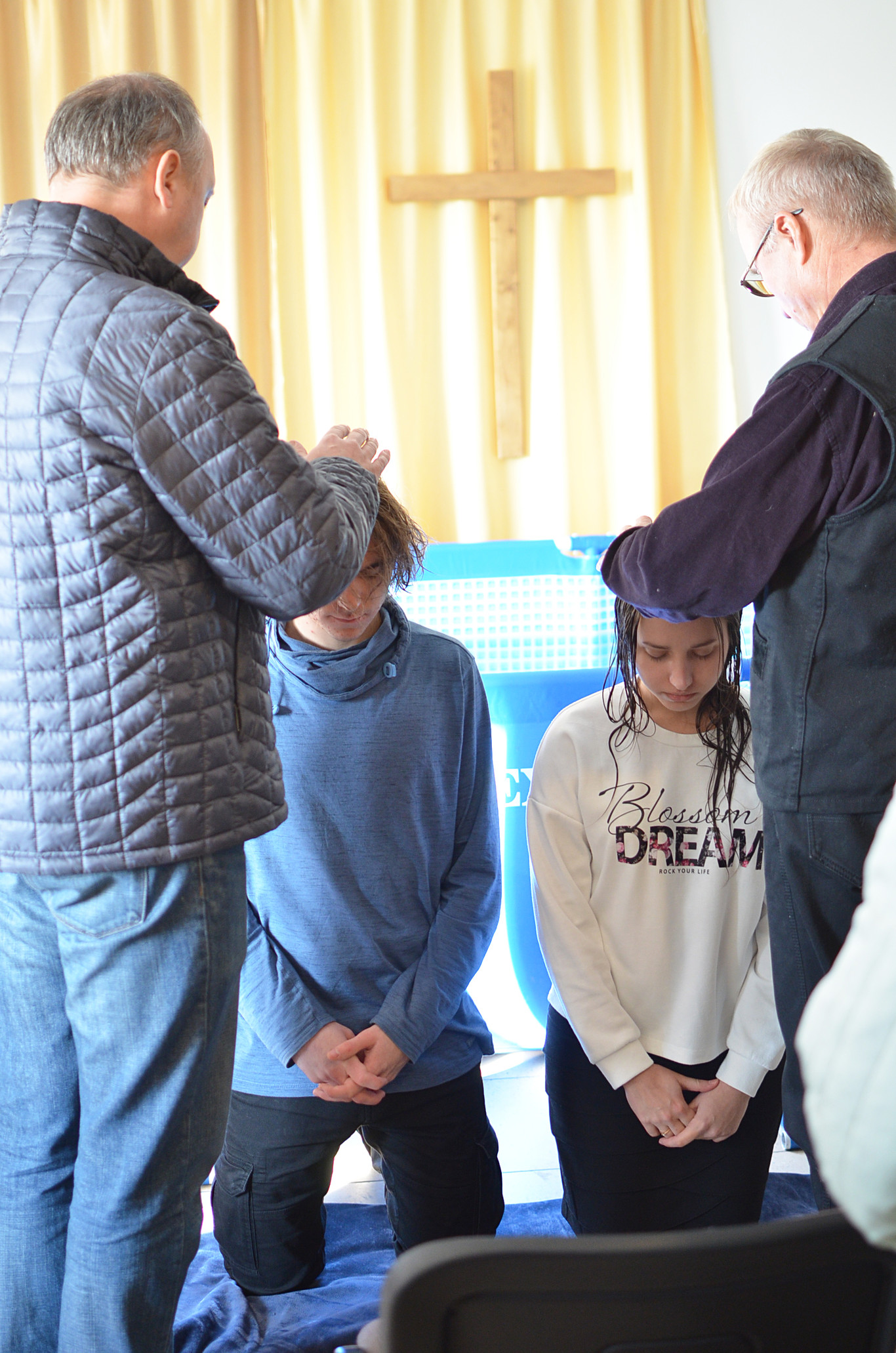 На следующий день крещённые брат и сестра уже принимали своё первое хлебопреломление вместе с другими детьми Божьими, после чего все желающие могли поздравить Юлю и Женю, пожелав им верно следовать за Христом и не отступать от Него никогда.